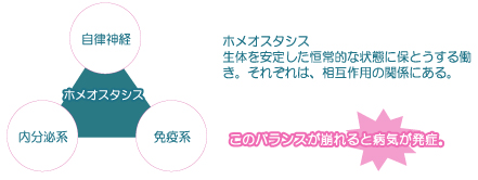 自律神経は慢性の肩こりや腰痛などの発症前後で深い関係にあります。この自律神経は、カラダの状態を一定に維持しようとする※ホメオスタシスの働きを担い、内臓や血管の収縮・拡張、ホルモン分泌など、すべての器官を調整しています。 よって、自律神経のバランスが崩れることは、病気の発症を意味することになります。
